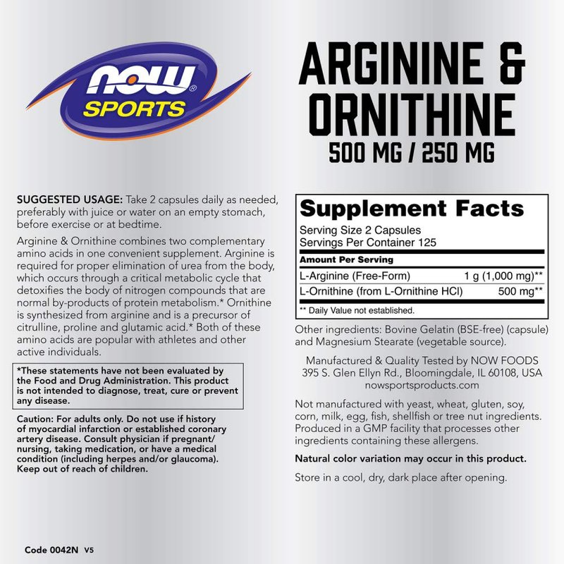 NOW Foods Sports Nutrition, Arginine & Ornithine 500/250 mg, Amino Acids, 250 Veg Capsules