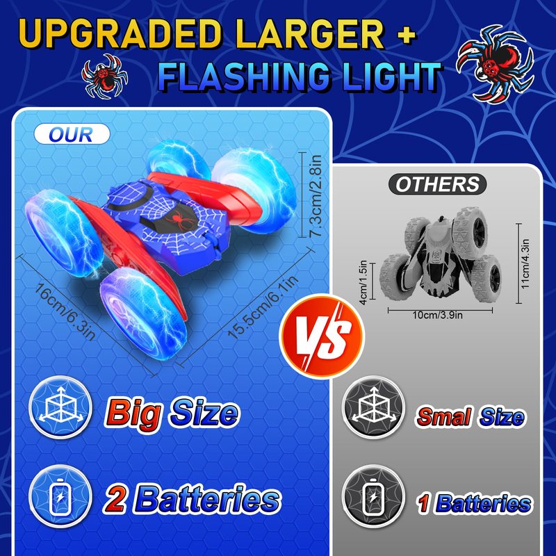 - 🕷️【360° Spins & Flips Spider RC Cars】Unleash thrilling stunts with our spider remote control car! Designed for adventurous kids, it performs incredible 360° spins and 180° flips, providing endless entertainment. Perfect for indoor and outdoor fun, this remote control cars guarantees action-packed playtime