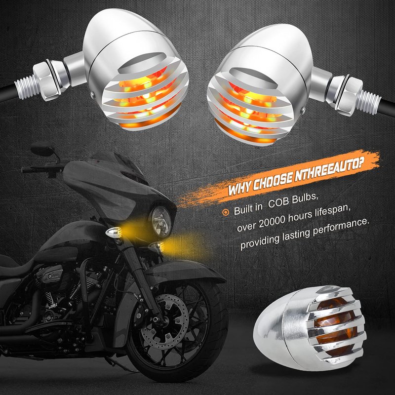 - 【3X Brighter Than Factory Light】Built-in COB LED bulbs, providing brighter light output, greatly increased your visibility at night, foggy and rainy days or any extreme weather, make your driving safer. Made of CNC machined aluminum, sturdy and make it resistant to shockproof, corrosion and waterproof. Chrome with amber lens, add features to your motorcycle.