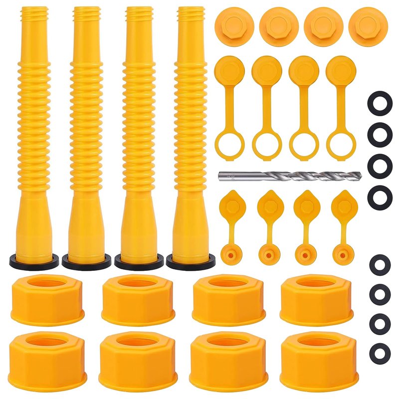 - SIMPLE INSTALLATION--Each set of products includes, 8 Screw Collar Caps, 4 yellow Spouts and 8 rubber gaskets, 4 nozzle caps with threads, 2 kinds of gas can vent caps (4 of each type, totaling 8), And the drill bit required to install the gas discharge cap. During the installation and use process, if you need assistance, you can contact us, and we will serve you as quickly as possible.