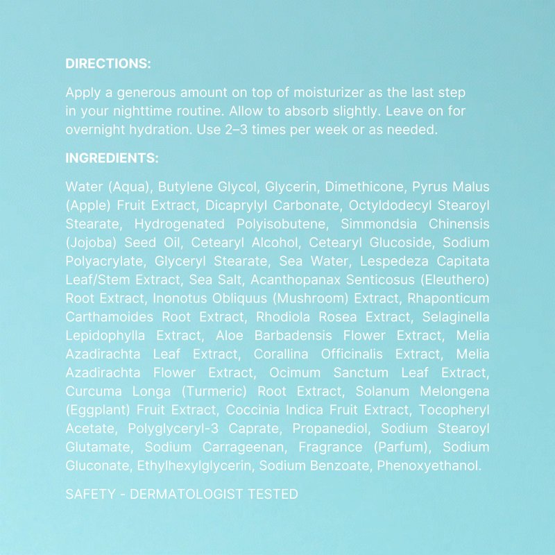- 𝖯𝖱𝖤𝖬𝖴𝖨𝖬 𝖨𝖭𝖦𝖱𝖤𝖣𝖨𝖤𝖭𝖳𝖲: Our hydrating mask is crafted with premium ingredients for comprehensive skin wellness. It contains Bioadaptive Botanical Complex, Roundhead Bush Clover, Deep Sea Water, Red Algae, and Apple Extract.