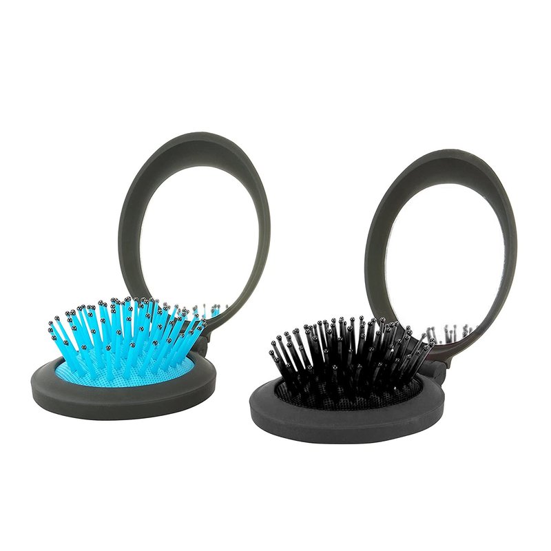 NuAngela Mini Hairbrush, Folding Hair Brush With Mirror Set, Compact Pocket Size, Travel Pop Up Hair Comb, Easy Keep in Purse, Gym Car Bag (2 Count (Pack of 1), Black Blue)