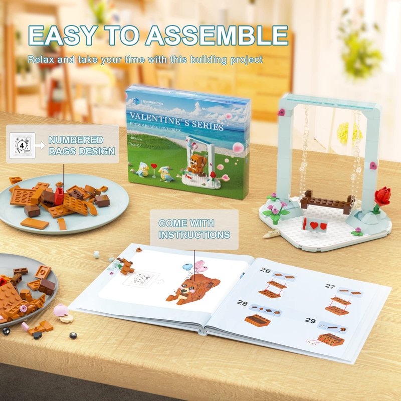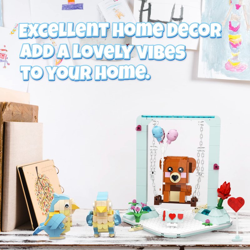- DELIGHT YOUR LOVED ONES WITH THIS CUTE BUILDING KIT, This collectible cute building set contains a cute brown bear holding three balloons sitting on a swing filled with flowers on a heart-shaped ground that can swing. and two love birds guarding the cute bear. Rose, Lipsticks, Heart Arrow, I Love You Board and other specially designed for expressing love can be found in this sets.