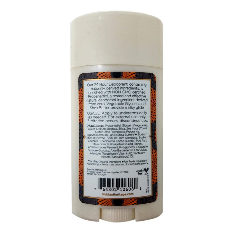 Nubian Heritage 24 Hour All Natural Deodorant African Black Soap With African Black Soap Extract, Shea Butter, Grapefruit Seed Extract, Vitamin E and Sandalwood Oil, 2.25 oz (64 g) each - African Black Soap 24-Hour Deodorant is a cruelty-free way to stay sweet-smelling all day long. Made with certified organic shea butter that loves your skin, this Nubian Heritage deodorant leaves out all the usual irritation suspects, like baking soda and aluminum. In their place, we infuse Nubian Heritage African Black Soap Deodorant with sweet sandalwood oils for a subtle, woodsy scent and all-natural corn starch to keep wetness in check. Sensitive skin can be a sore subject around deodorants, so we read through all our Nubian Heritage deodorant reviews and really paid attention. The result is our line of 24-hour deodorants featuring organic and fair trade ingredients that nourish and soothe your skin - like our certified organic shea butter. We've tested a few of our own products out on ourselves, but they are never tested on animals! Nubian Heritage is dedicated to maintaining the accuracy of the ingredient lists on this website. However, because raw ingredients listings are subject to change due to INCI, we cannot guarantee that these lists are complete, up-to-date, and/or error-free. For an accurate listing of ingredients in each product, please refer to your product packaging. Usage Instructions: Apply to underarms daily as needed. If irritation occurs, discontinue use.