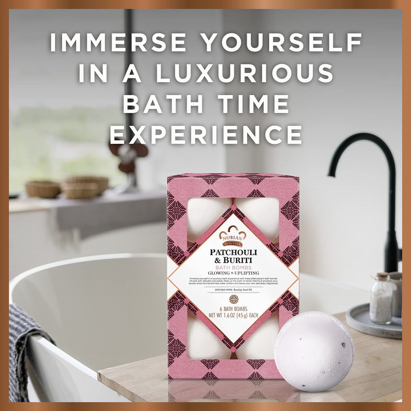 - Nubian Heritage Patchouli and Buriti bath bombs are ideal for a relaxing bath experience. Infused with Rosehip Seed Oil, these bath and body products have an uplifting scent