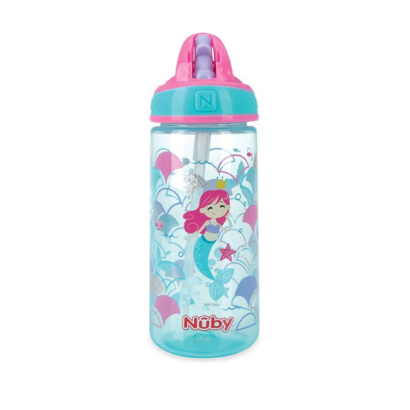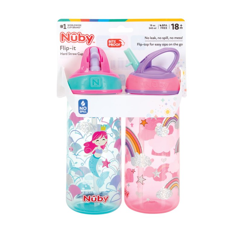 Nuby 2 Pack Iridescent PP Flip-it Kids On-The-Go Printed Water Bottle with Bite Proof Hard Straw - 18oz / 540 ml, 18+ Months, 2 pk, Mermaid & Rainbow Print
