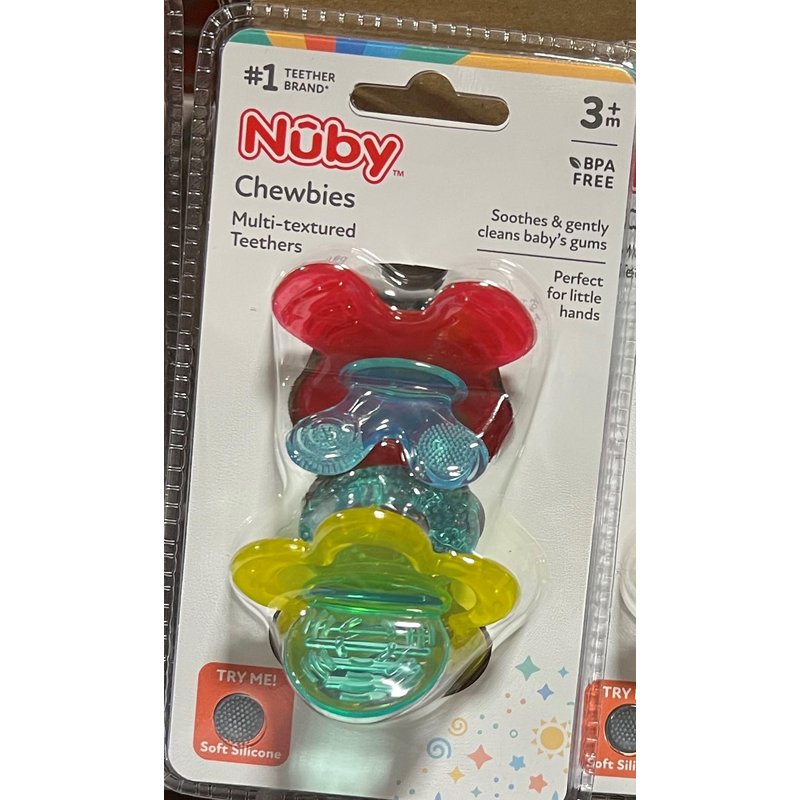 The Nuby Chewbies teether’s unique textured design provides comfort to baby’s delicate gums. It also helps to clean and massage baby’s gums. It provides stimulus to the lips and tongue which promote the transition from nursing to chewing. The design of the Chewbies teether is perfect for little hands. Plus, it’s BPA Free.