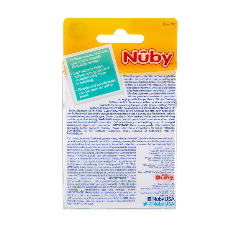 - TEETHING TOY FOR 3+ MONTHS: Nuby's Happy Hands Silicone Teething Mitten helps soothe your little one's tender gums and new tooth pain