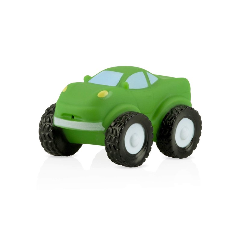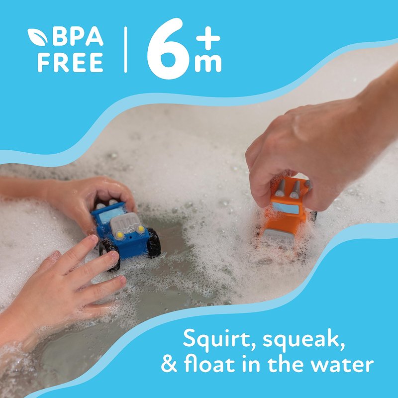 - BUBBLE BATH FUN: Interactive car-shaped water squirting baby toys for bath tub play time; Cruise into fun with a green sports car, a blue semi-truck, an orange semi- truck, and a red SUV
