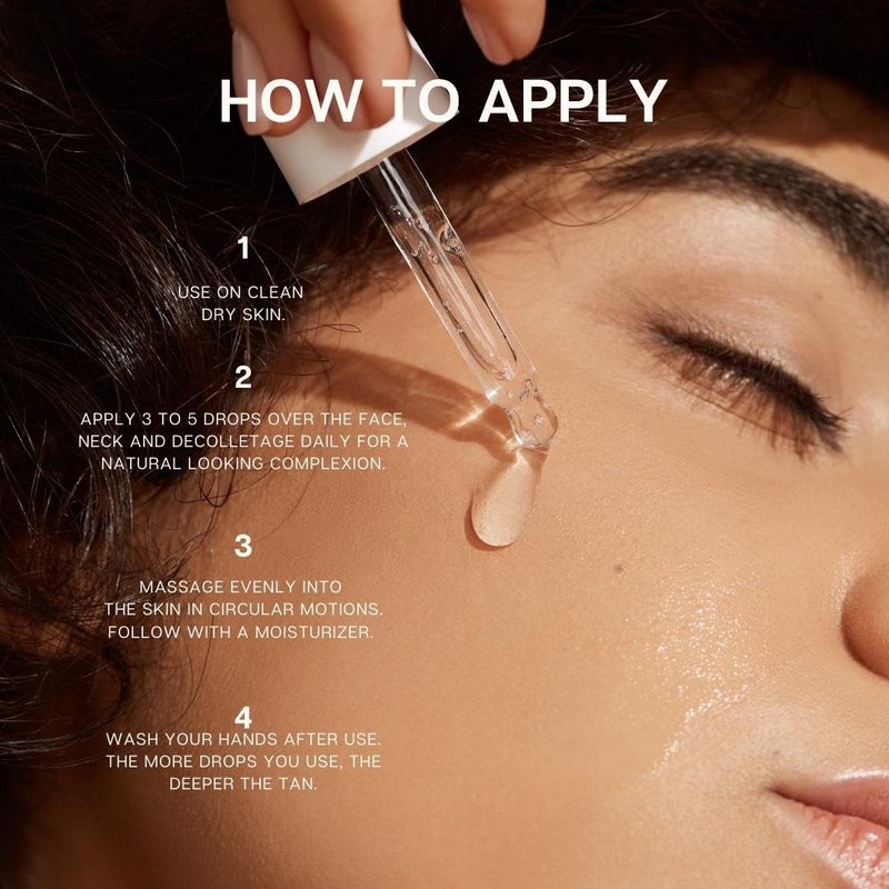 - GLOW DROP APPLICATION - Apply 3 to 5 drops on clean and dry face, neck, and decolletage daily for a natural-looking complexion. Massage the self tan face drops evenly into the skin in circular motions, adding more to achieve a deeper tan, as desired. You may then follow with a moisturizer. The self tan drops for face can also be mixed with your go-to moisturizer.