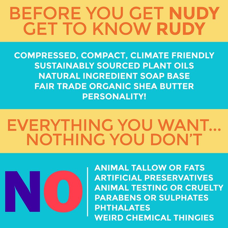 - Everything You Want & Nothing You Don't: NUDY RUDY soap bar pucks are made in Australia using ingredients that are good for your body. Our scents are specially formulated with no harsh ingreidents and are paraben-free, sulfate-free & cruelty-free.