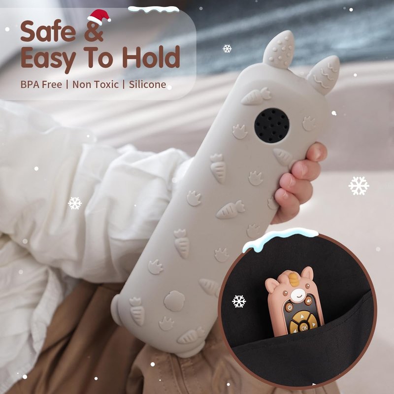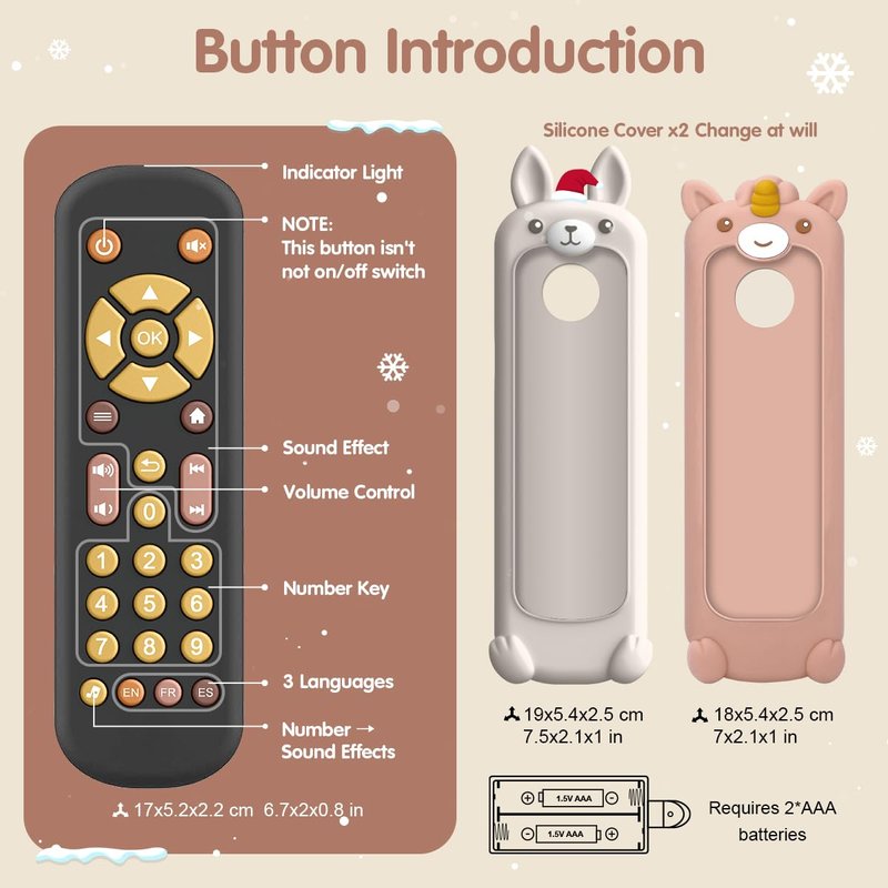 - Early Educational TV Remote: The TV remote control toy is an early educational learning toy for babies over 6 months who are curious about everything. Adorable silicone cover with engaging textures attract baby’s attention. Designed with colorful buttons, cultivate baby’s cognition and thinking ability. With soft light and interesting sound effects, offer sensory stimulation and visual and auditory development