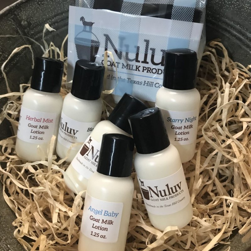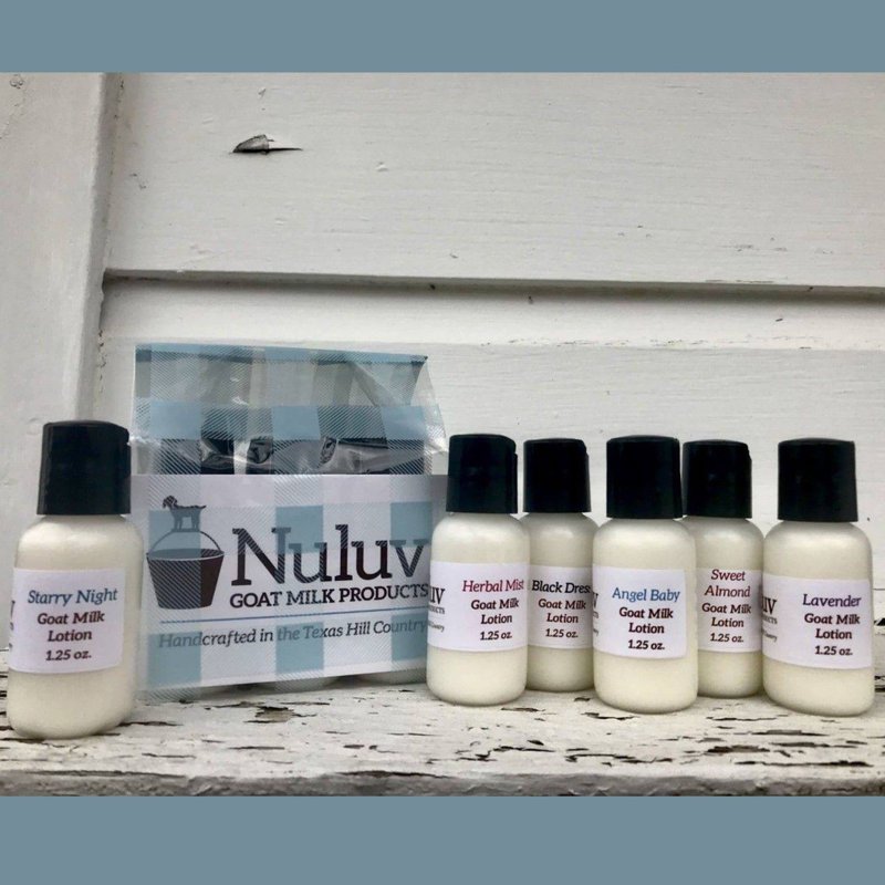 6-Pack of our travel size, moisturizing, small batch goat's milk hand and body lotion. 1.25oz each: Angel Baby, Lavender, Herbal Mist, Starry Night, Black Dress, and Sweet Almond. Goat Milk Skin Care Products, handcrafted on our farm, in the Texas Hill Country, since 2010. Nuluv is a 100% Hands-On goat dairy, meaning we don’t use any machines on our animals. We are committed to being a “cruelty free” dairy, and all of our girls are milked by hand, twice a day. We named our skin care company Nuluv Goat Milk Products, after our girls (Nuluv Nubians). All of our goat milk goodies are handcrafted on our property, with fresh milk from our own herd. Gentle for all skin types and children.