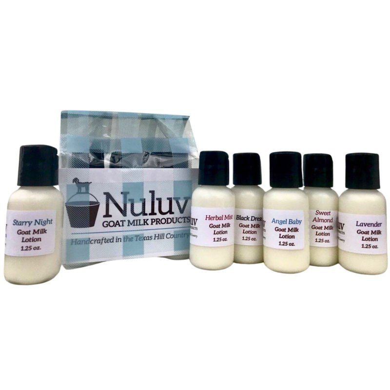 NULUV 6-Pack Sampler Travel Size Goat Milk Body Lotions Soothing for Hands and Body, Soft, Healthy Skin Cruelty-Free and Paraben-Free, Made in USA, Favorite Scents
