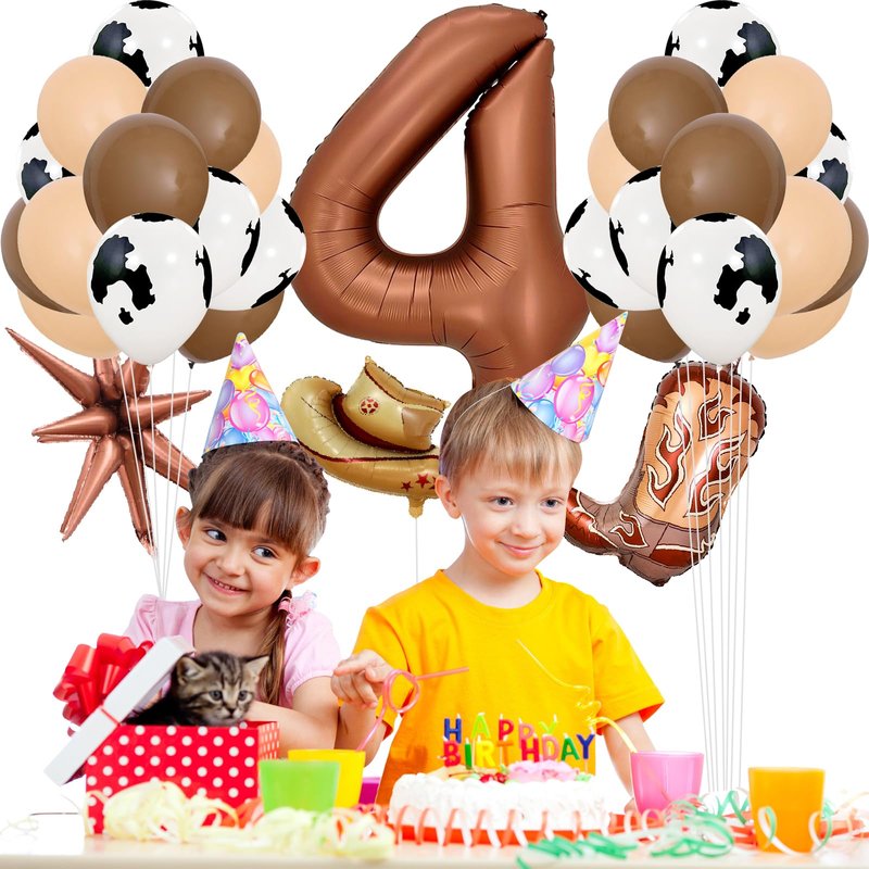 Number 4 Balloons Cowboy Themed Party Decorations, 40inch Foil Balloon Brown Number Balloons, Cow Balloons Cow Farm Cowboy Hat Balloons for Kids Cowboy Birthday Party Decorations