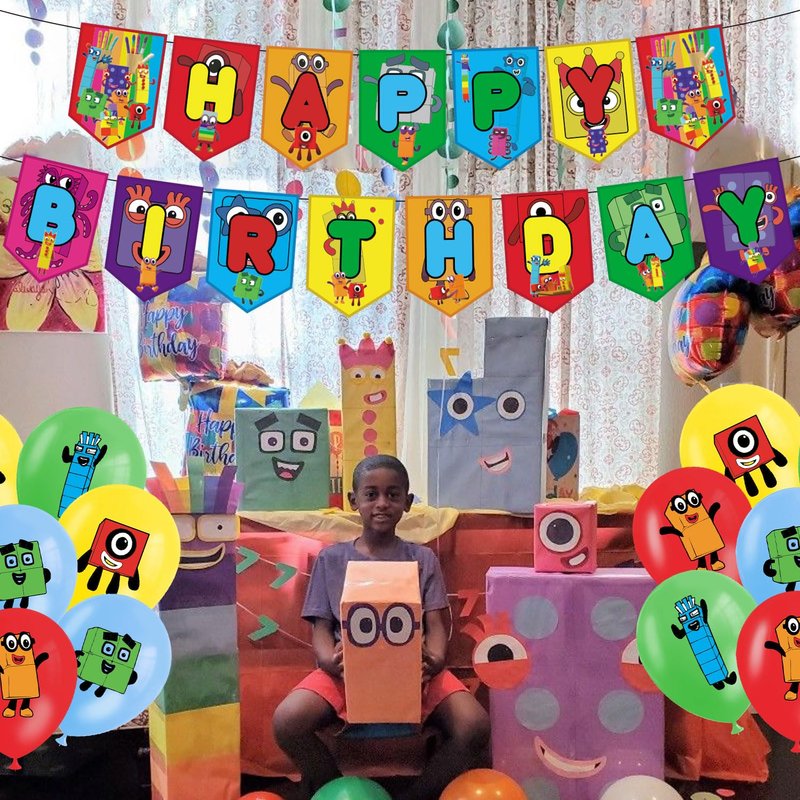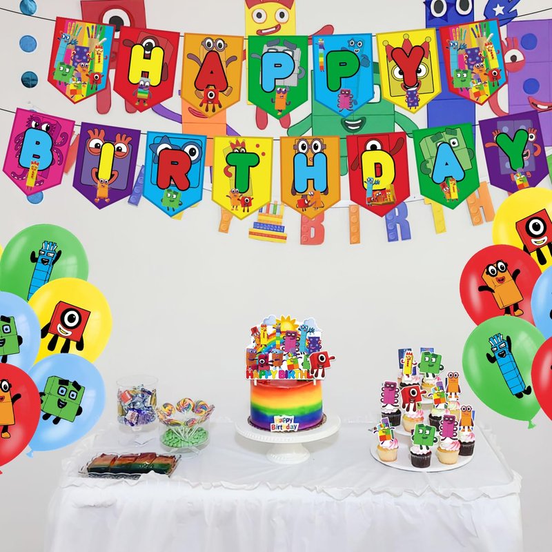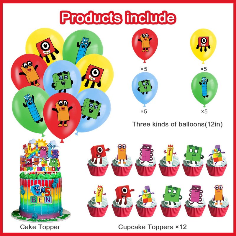 - ♥What You Will Get: Package comes with 1 set of happy birthday banner, 16 pieces of latex balloons(4 design), 1 pieces of big cake topper, 12 pieces of cupcake topper(6 styles). It has everything you need to throw a cartoon themed party! which will create a Number Advanture atmosphere, super cute and unique.