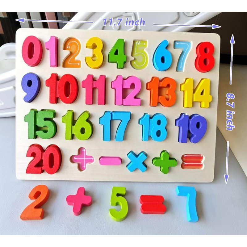 - 【Engaging Montessori Learning】Each puzzles for toddlers 3-5 have 26 pieces of 0 to 20 wood number blocks and a wooden number puzzle board including plus, minus, multiply, divide and equals signs.Vibrant illustrations and tactile engagement stimulate sensory and cognitive development.Writing arrows to guide children in developing correct writing habits