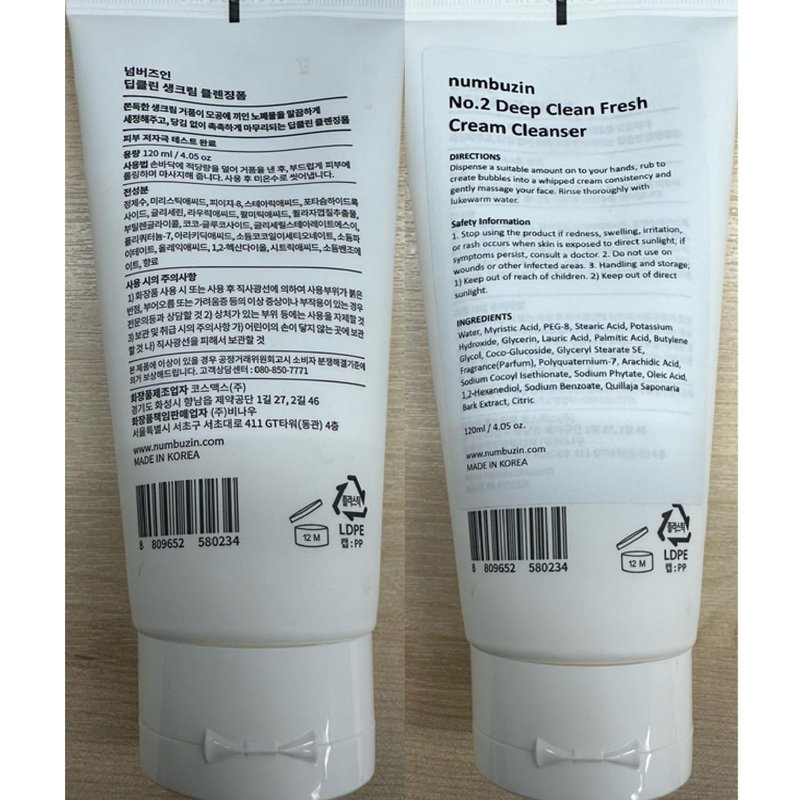 numbuzin No.2 Deep Clean Fresh Cream Cleanser | Face Wash, Rich Foam, Natural Cleansing Ingredients | Korean Skin Care for Face, 4.05 fl oz