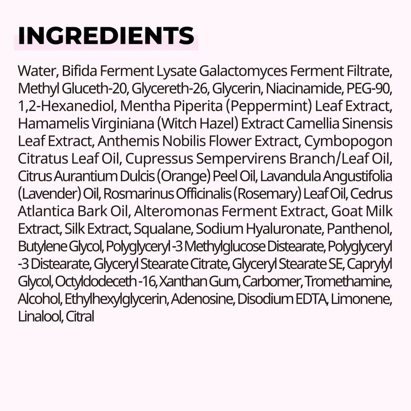 - KEY INGREDIENT : Bifida, Tingle pore omplex, Mentha piperita leaf extract, Camellia sinensis leaf extract, hamamelis virginiana extract, Lavadula angustifolia oil, Anthemis nobilis flower extract
