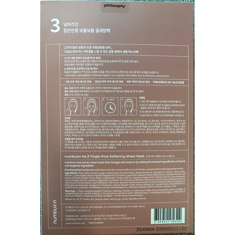- numbuzin No.3 Tingle-Pore Softening Sheet Mask : A texture care serum sheet mask that changes skin texture by adding fermented ingredients and pore convergence ingredient.