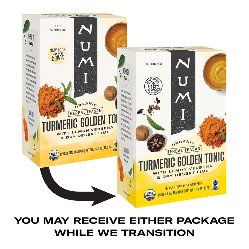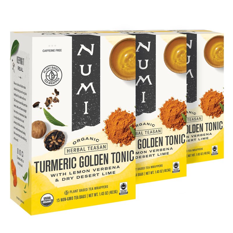 Numi Organic Golden Tonic Turmeric Tea, 15 Tea Bags (Pack of 3) With Lemon Verbena & Lime, Caffeine Free, Packaging May Vary