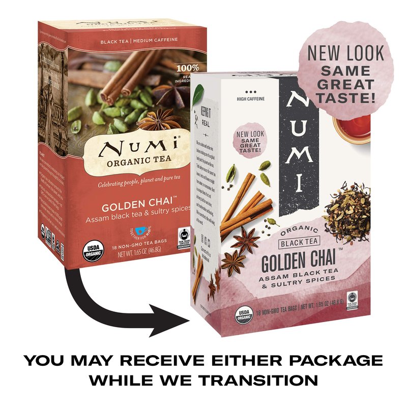 Numi Organic Tea's Golden Chai is a traditional Indian treasure. A rich and spicy blend of organic hearty Assam black tea and organic cinnamon cardamom and ginger this tea is great with milk! Throughout India chai stalls are a meeting place for provocative tea and conversation. From its homeland in China cha has journeyed as chai thé and tea recreating itself in every land. Numi's golden brewed organic Chai fuses rich cultures in a complex and hearty Assam black tea. The workers at this organic tea estate in Assam India have allocated their Fair Trade funds towards school scholarships new roads mosquito nets and womenâ€s self-empowerment programs. About Numi: Numi is a labor of love by a brother and sister. She is the artist and he is the alchemist behind all of Numiâ€s blends. Their exceptional-tasting teas are captured in unique blends that use the highest quality organic non-GMO ingredients sourced directly from Fair Trade Certified gardens. Numi combines premium full-leaf quality teas and herbs with only 100% real fruits flowers and spices. “Through authenticity creativity and commitment to people and planet Numi brings you the purest best tasting organic teaâ€