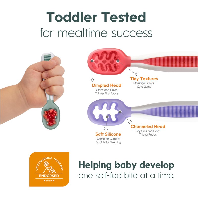 - SIMPLE TO CLEAN & PEDIATRIC OT RECOMMENDED: Approved and tested by baby care experts, our spoons are incredibly durable, ensuring long-lasting use. Made with food-grade silicone, they’re free from harmful chemicals like BPA and phthalates so you can feel good about giving them to your little one. Clean up is easy in the dishwasher. Microwave or steam-sterilizing is not recommended (and not needed).