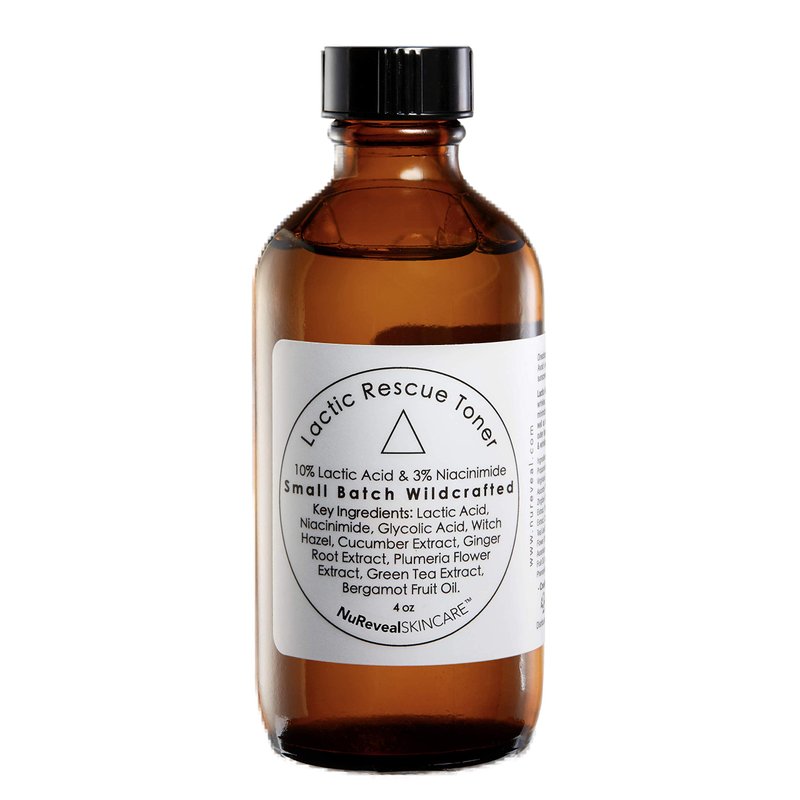 Lactic Rescue Toner is an exfoliating toner for face with essential oils. Lactic Rescue Toner has 10% Lactic Acid as well as 3% Niacinamide. This combination will exfoliate the outer most layer of skin and will fade acne scars as well as sun spots. For sensitive skin use 3 times weekly instead of nightly.