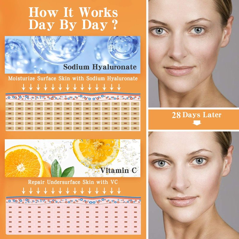 - Brightening & Hydrating Serum: High concentration vitamin C face serum is packed with nutrients designed to brighten, tone, and smooth the skin's texture for increased radiance, providing brighter skin results. This antioxidant serum can be used as a dark spot diminisher for any troubled spots or on areas that need skin discoloration help. Hyaluronic Acid deeply hydrates and plumps the skin instantly hydrating, replenishing, and boosting the skin's ability to retain moisture.