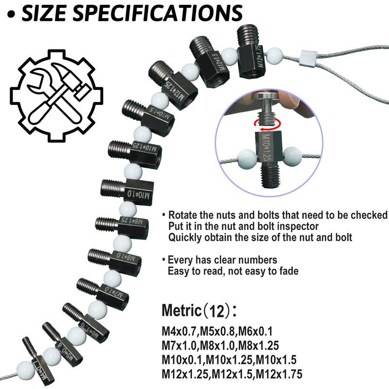 - 🔦Feature - The new upgrade!The Inch & Metric Thread Checker is an accurate and easy-to-use thread identifier for both nuts and bolts.Each individual gauge features a male threaded stud on one end and a female threaded hole on the other. The Thread Checker is especially well suited for distinguishing between similar inch and metric threads. Conveniently assembled onto a wire loop, it's the perfect portable solution!