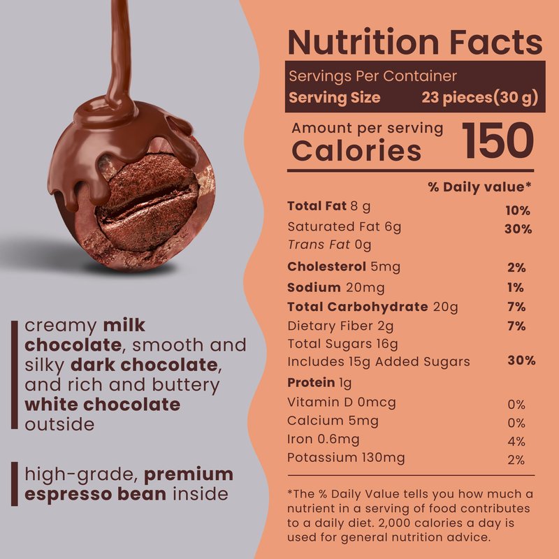- 🍫 Chocolate Coatings: Indulge in the luxurious trio of white, milk, and dark chocolate coatings that envelop our coffee beans. These chocolates provide the perfect balance to complement the coffee's robustness, resulting in a harmonious fusion of flavors.
