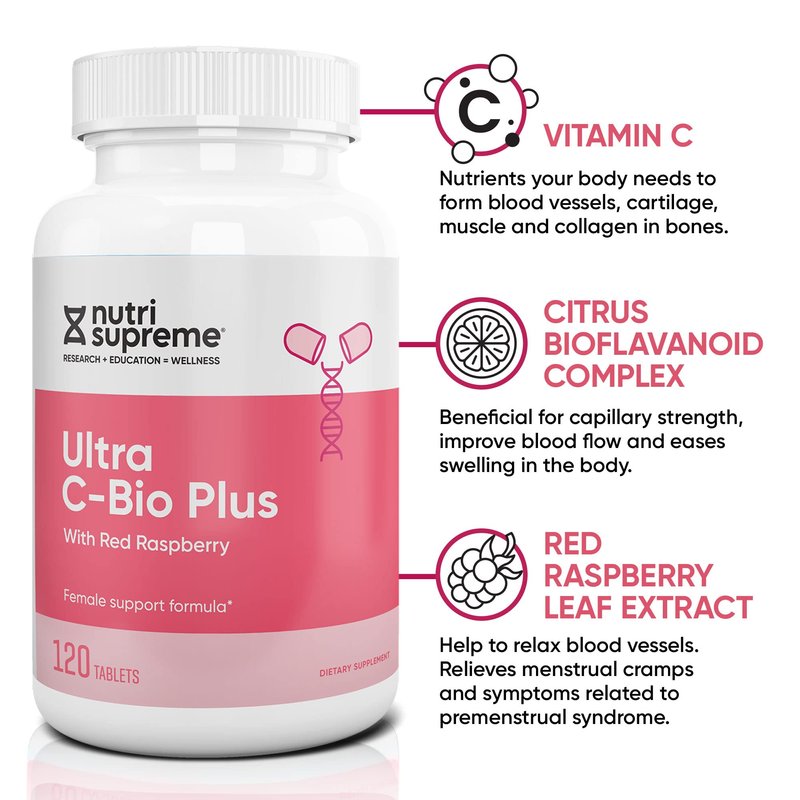 - POWERFUL FEMALE SUPPORT: This Ultra C-Bio Plus supplement is specifically designed to support the unique needs of women, with a carefully crafted blend of key ingredients like red raspberry, vitamin C, and bioflavonoids.