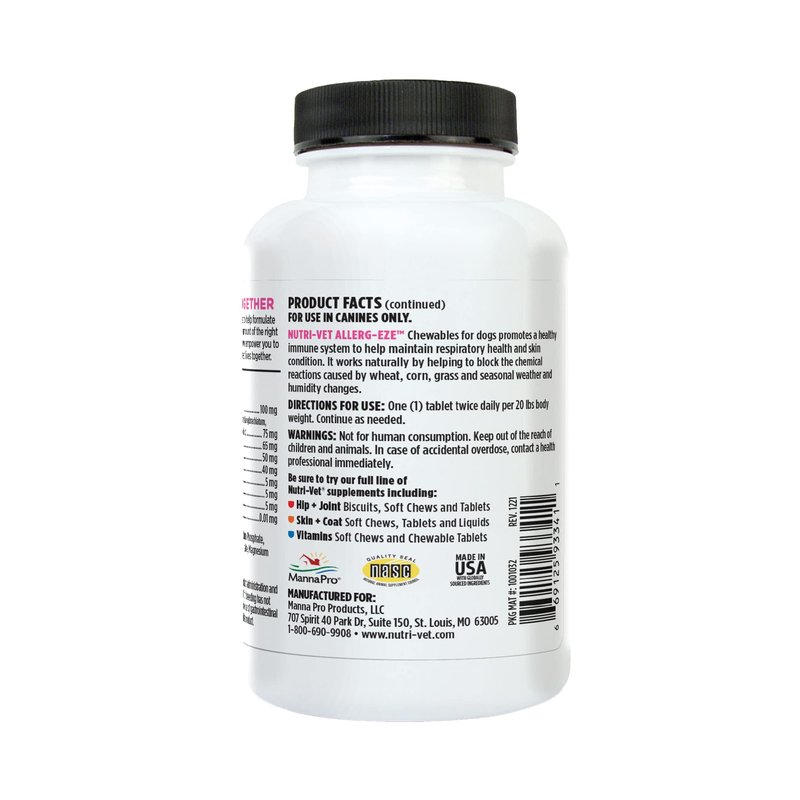 - DOG ALLERGY RELIEF CHEWABLE TABLETS - Nutri-Vet Allerg-Eze targets the root cause of allergies, helping to maintain normal respiratory function and health with a potent combination of antioxidants and omega-3 fatty acids