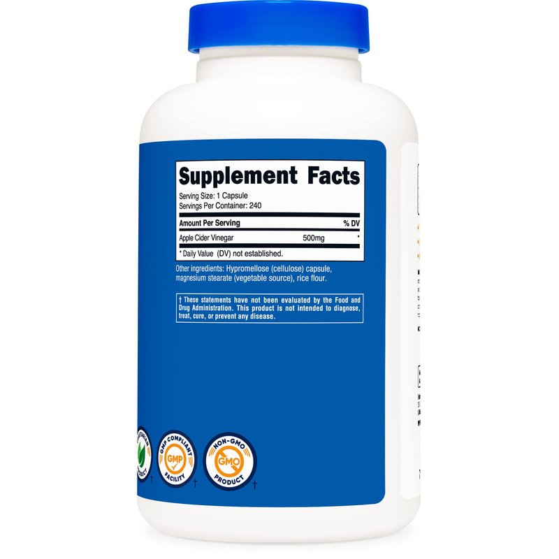 Nutricost Apple Cider Vinegar delivers high quality, pure apple cider vinegar powder in every capsule. Each batch is tested for quality and purity. There are 240 capsules for 240 servings (500mg each) per bottle. Apple Cider Vinegar (ACV) is the fermented juice of pressed, fresh apples. Sometimes used for cooking and cleaning, ACV has also been used for centuries as a traditional, natural remedy for a variety of health purposes. Nutricost Apple Cider Vinegar should only be taken in conjunction with a healthy diet. Do not exceed recommended dosage. Exceeding recommended dosage will not improve results. Nutricost, located and headquartered in the USA, only uses the best ingredients to ensure maximum quality and to help you feel your best! By keeping our supplement recipes simple and clean, you get the best experience possible with Nutricost. Our supplements are manufactured in a GMP-compliant and FDA-registered facility; and each batch of every product is tested by independent, ISO-accredited laboratories.
