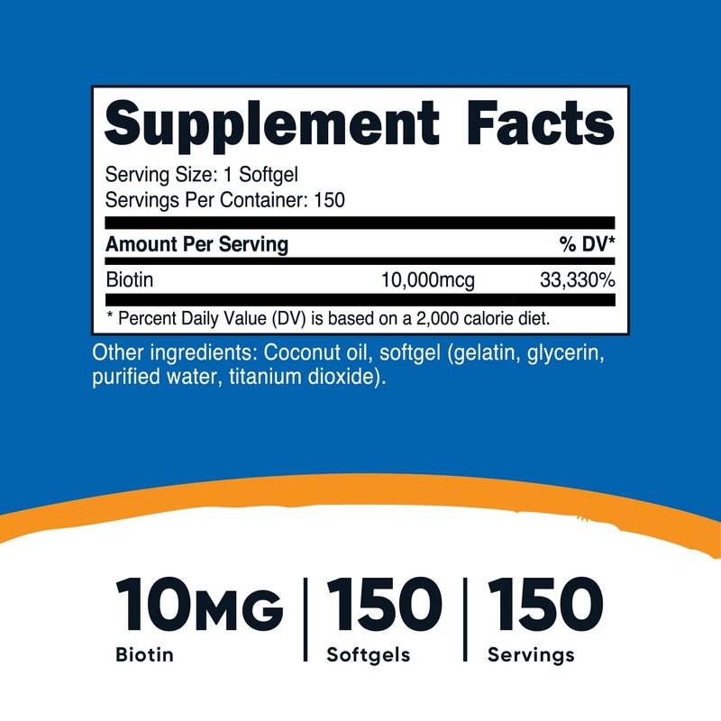 Nutricost Biotin (10,000mcg) in Coconut Oil 150 Softgels - Gluten Free, Non-GMO