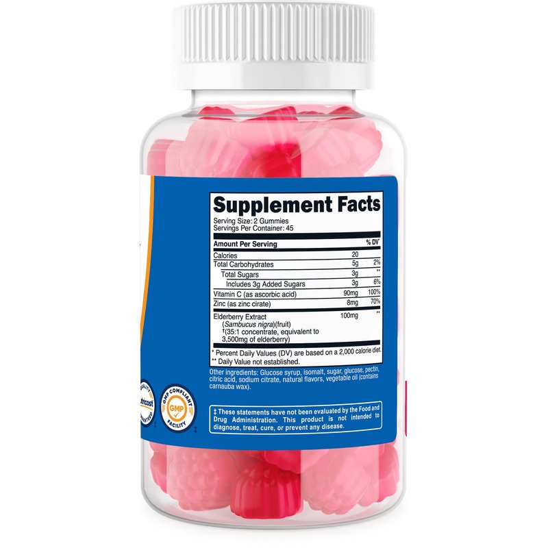 Elderberry, a fruit extract of the Sambucus tree, contains a rich source of antioxidants. Great tasting gummies make it easy to consume. Each bottle contains 90 gummies. At 2 gummies per serving, each bottle has 45 servings if taken according to recommended use. Each serving contains a 3,500mg of elderberry equivalent (from 100mg of 35:1 concentrate). They also contain 90mg of Vitamin C and 8mg of Zinc.