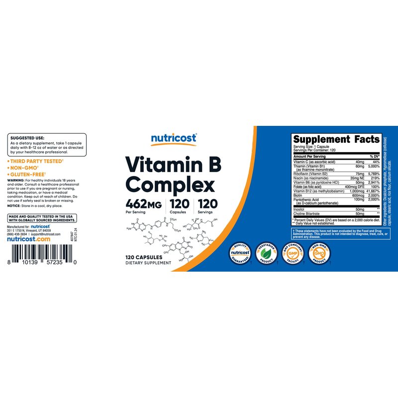 Nutricost's Vitamin B Complex is a High Potency Formula packed with Vitamins B1, B2, B3, B5, B6, B7, B9 (Folic Acid), B12 and also Vitamin C. Nutricost strives to bring you the highest quality products and at affordable prices.
