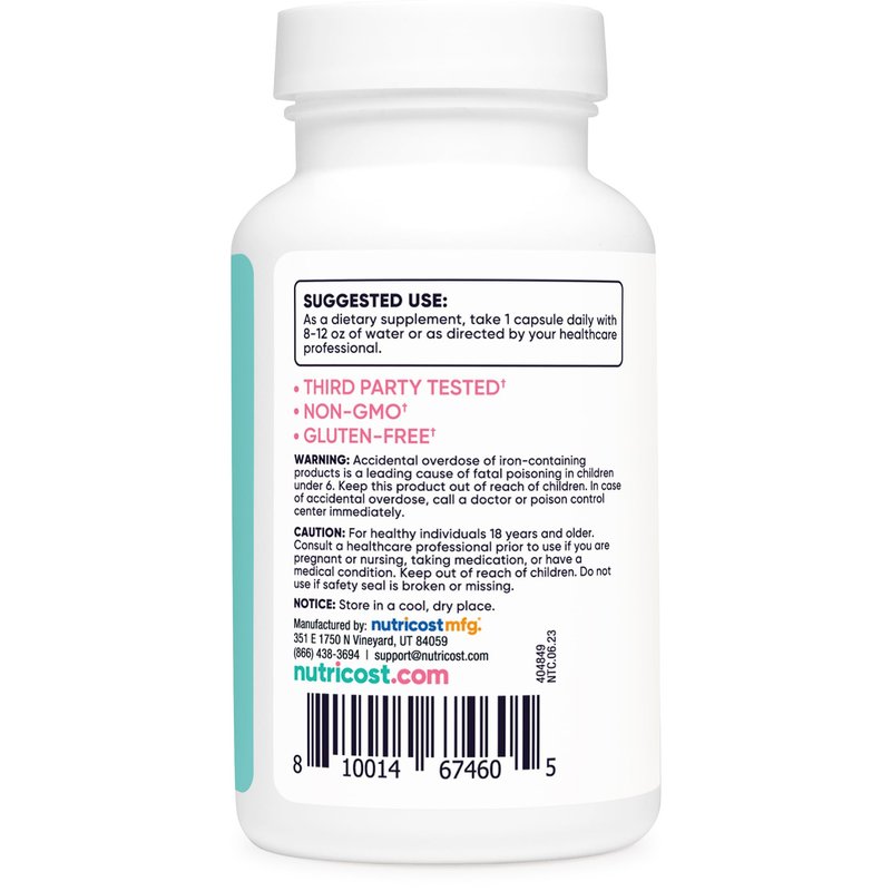 Nutricost's Iron for women is packed with 65mg of Iron, 45mg of Vitamin C, 200mcg of Folate (120mcg of folic acid), and 500mcg of Vitamin B12. This supplement has been specifically formulated for women and contains 180 capsules per bottle.