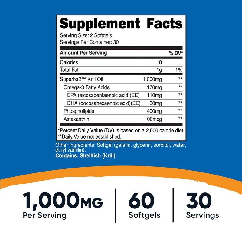 Krill oil provides two crucial omega-3 fatty acids: EPA (eicosapentaenoic acid) and DHA (docosahexaenoic acid). EPA. Nutricost's Krill Oil Capsules contain 1000mg of Krill Oil Per Serving and 60 softgels per bottle for 30 servings.