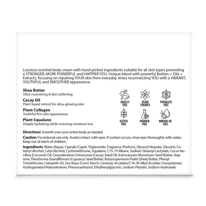 Introducing Nutrius Brazilian Body Butter Cream Botanical Bliss, a luxurious elixir meticulously crafted to envelop your skin in pure indulgence. Enriched with a carefully curated selection of exquisite botanicals, this sumptuous formula delivers unparalleled hydration and nourishment, unlocking your skin's natural radiance with every application. Prepare to immerse yourself in a sensorial journey as the rich, creamy texture of our Botanical Bliss Body Butter Cream melts effortlessly into your skin. Infused with nature's finest treasures, including potent botanical extracts and emollient-rich oils, each 6 FL OZ jar holds the promise of transformative skincare bliss. Experience the rejuvenating power of botanical wonders as they work in harmony to replenish and revitalize your skin from within. Whether it's the moisture-locking properties of Cupuacu butter, the antioxidant-rich benefits of Acai berry, or the soothing properties of Mango and Cocoa extracts, our formula is designed to pamper your skin with the utmost care and attention. But the magic doesn't stop there. Nutrius Brazilian Body Butter Cream Botanical Bliss goes beyond mere hydration, unveiling your skin's natural radiance and leaving it with a luminous, youthful glow that's sure to turn heads. With each use, you'll feel more confident, more radiant, and more in tune with your skin's true beauty. Indulge in the ultimate skincare luxury and elevate your self-care routine with Nutrius Brazilian Body Butter Cream Botanical Bliss. Let nature's botanical treasures nourish and nurture your skin, and embrace the beauty of radiant, healthy-looking skin with Nutrius.