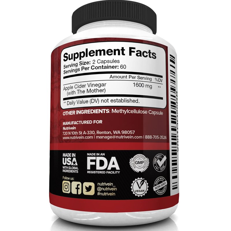 - ✔ Trusted Brand - Satisfaction Assured: If our Apple Cider Vinegar Capsules do not wow you and you don't absolutely love them, your purchase is on us; No Questions Asked; Our world-class customer service wants you to be satisfied with your purchase; Absolutely no risk; The bottle comes with the Nutrivein Satisfaction Pledge for 30 days. Have this healthy weight management supplement by your side.