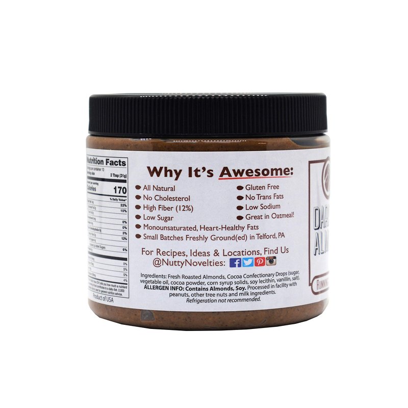 - CHOCOLATY GOODNESS: Dark Chocolate Almond Butter from Nutty Novelties combines the invaluable nutrition of handpicked almonds with the lavish taste of premium dark chocolate; Sweet almond butter for pretzels, oatmeal & more
