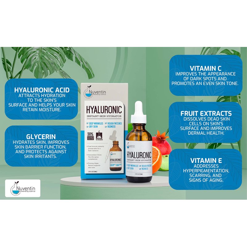- WRINKLE REDUCER – Are wrinkles, fine lines, and dry skin making you conscious about how you look? Revive the firm, glowing, and gorgeous skin from your youth with Nuventin Hyaluronic Acid Facial Serum! Hyaluronic Acid brightens, plumps, and lifts sagging skin.