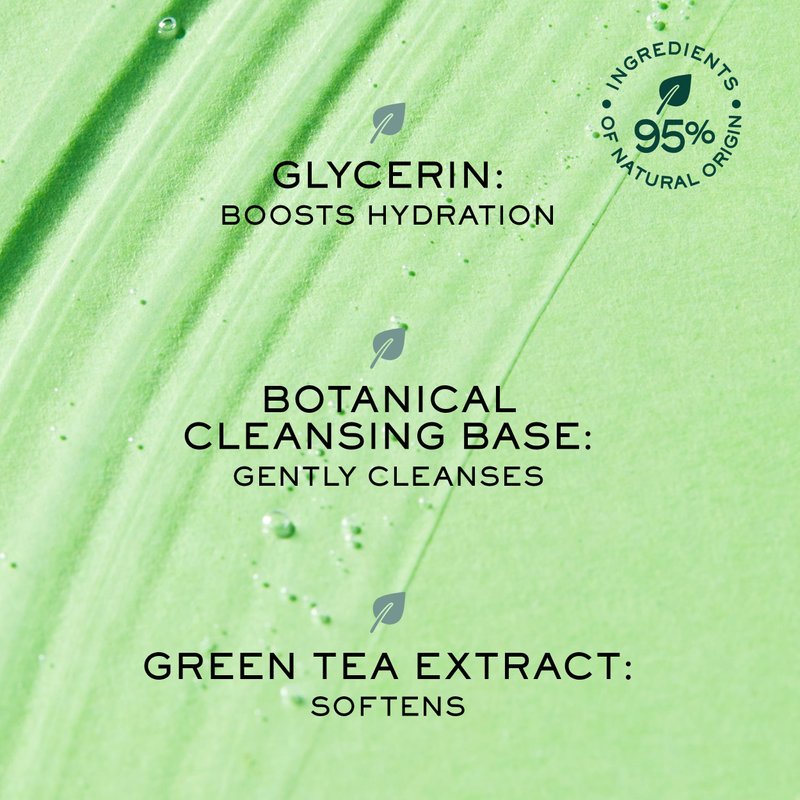 - 𝟵𝟱% 𝗳𝗿𝗼𝗺 𝗻𝗮𝘁𝘂𝗿𝗮𝗹 𝗼𝗿𝗶𝗴𝗶𝗻 ingredients: Gentle and effective botanical cleansing base with green tea extract