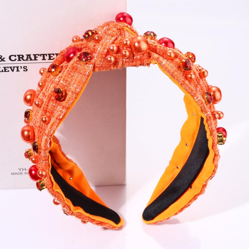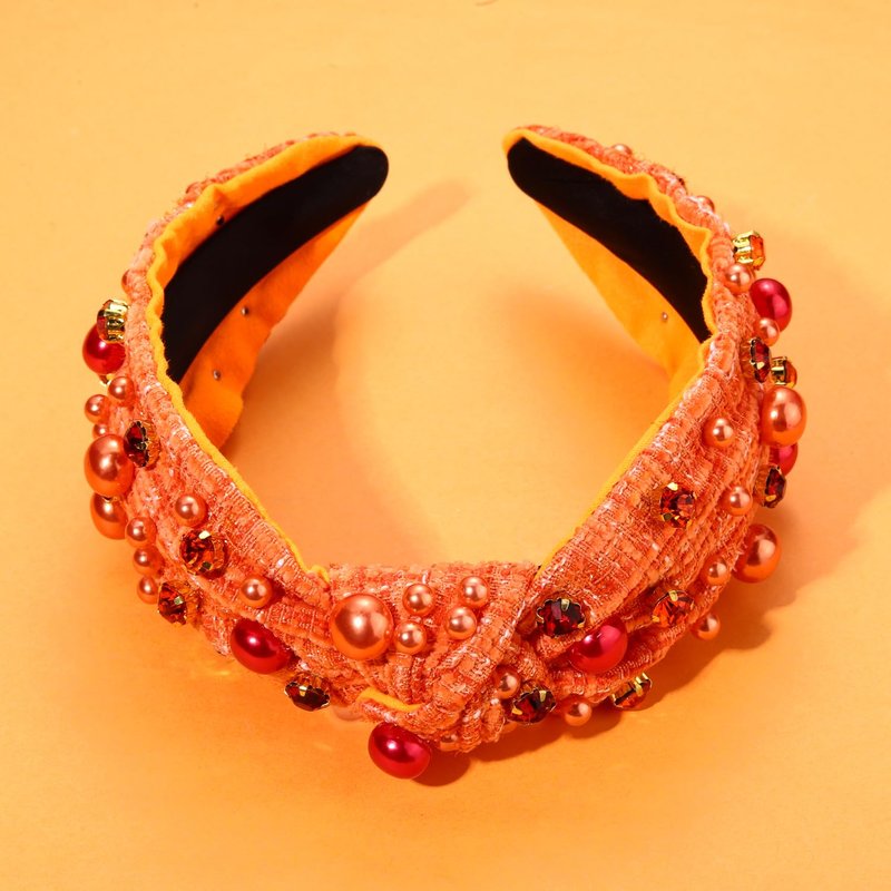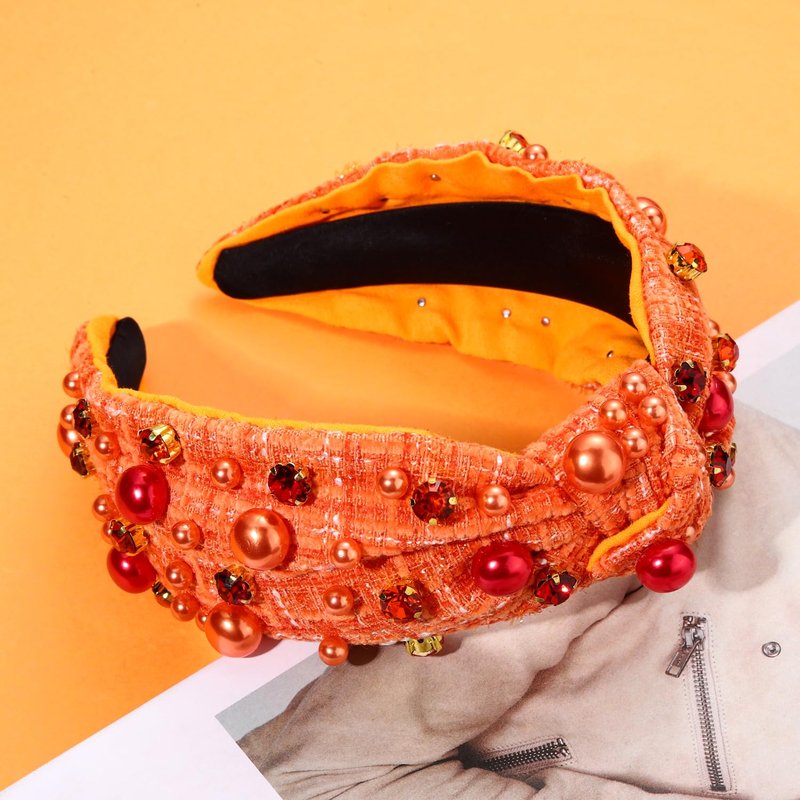 NVENF Fall Headbands for Women Pearl Crystal Thanksgiving Headband Orange Rhinestone Embellished Jeweled Headbands Thanksgiving Fall Hair Accessories Gifts (Orange)