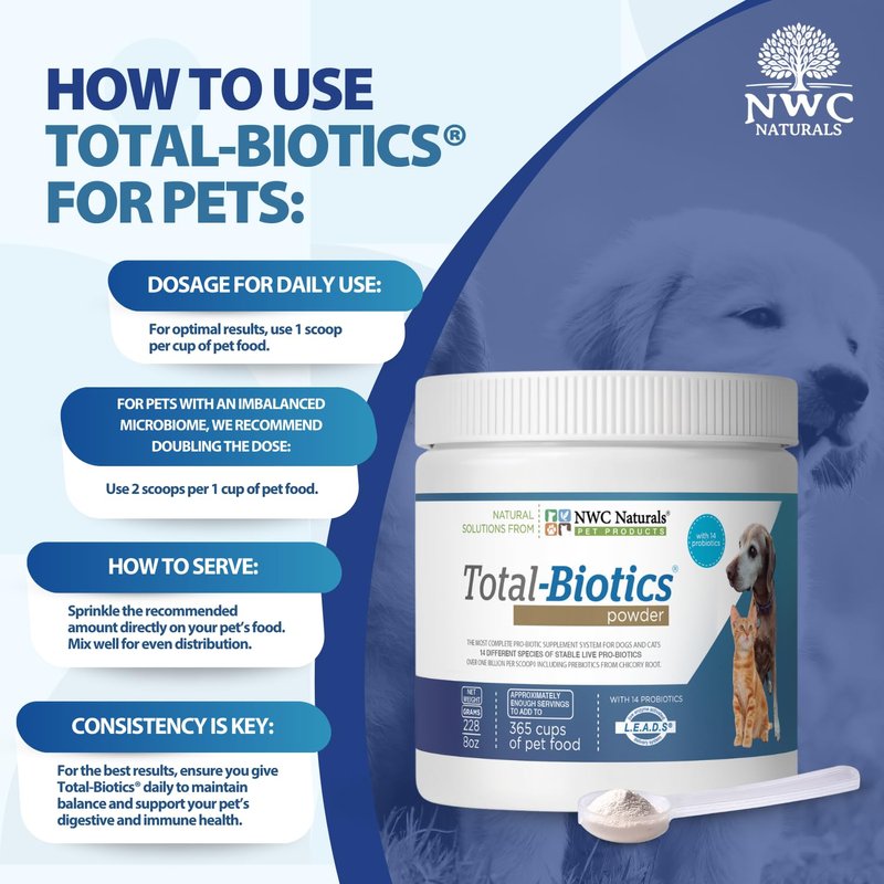 NWC Naturals Total-Biotics, Cat & Dog Probiotics for Digestive Health with Prebiotic, Unflavored Probiotic for Dogs & Cats, Supplement for Gut, Skin, Coat, Upset Stomach Relief, 365 Servings, 8 Ounces