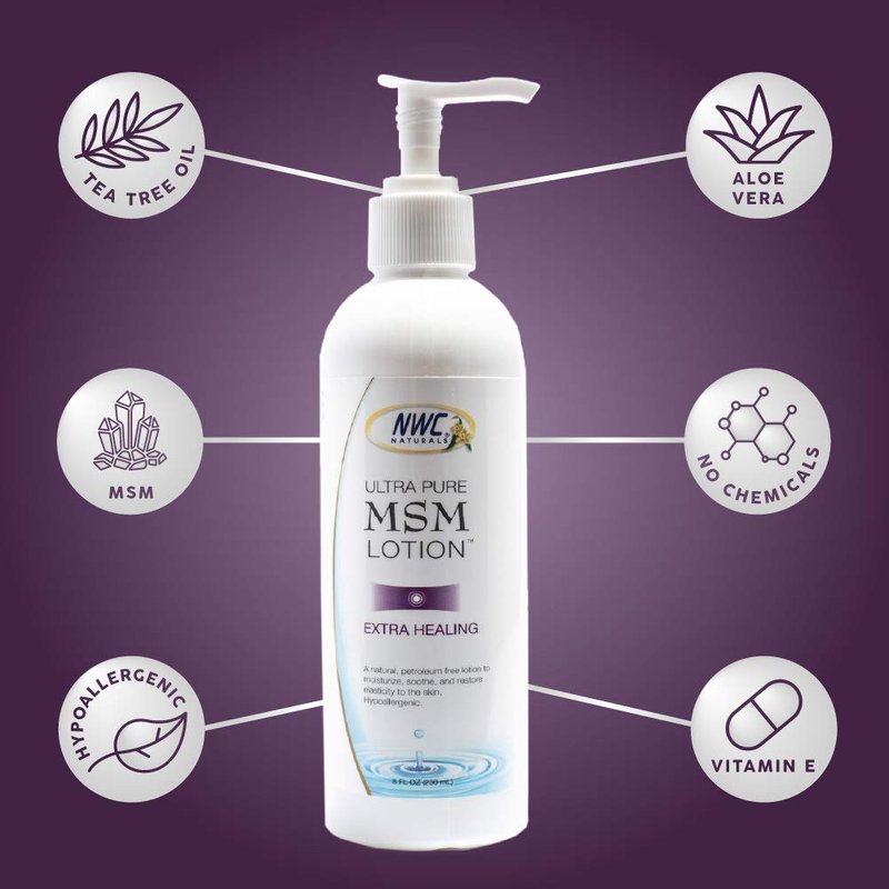 - EXTRA-HEALING: Our Ultra-Pure MSM Lotion contains extra MSM and Tea Tree Oil. This extra-healing lotion can help support back pain, muscle pain, and stress from athletic injuries, while providing temporary muscle relief. This lotion is great for deep tissue massage and gives your skin the nourishment it needs to last throughout the day.
