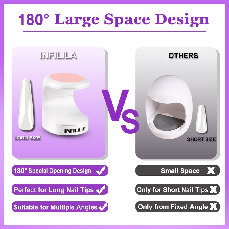 - 180°Opening Design:The expanded opening makes it more flexible, allowing you to insert your finger from multiple directions without worrying about the nail getting too long and not fully covered. The nail dryer works with both short and long nailsand can help your nail polish dry evenly!
