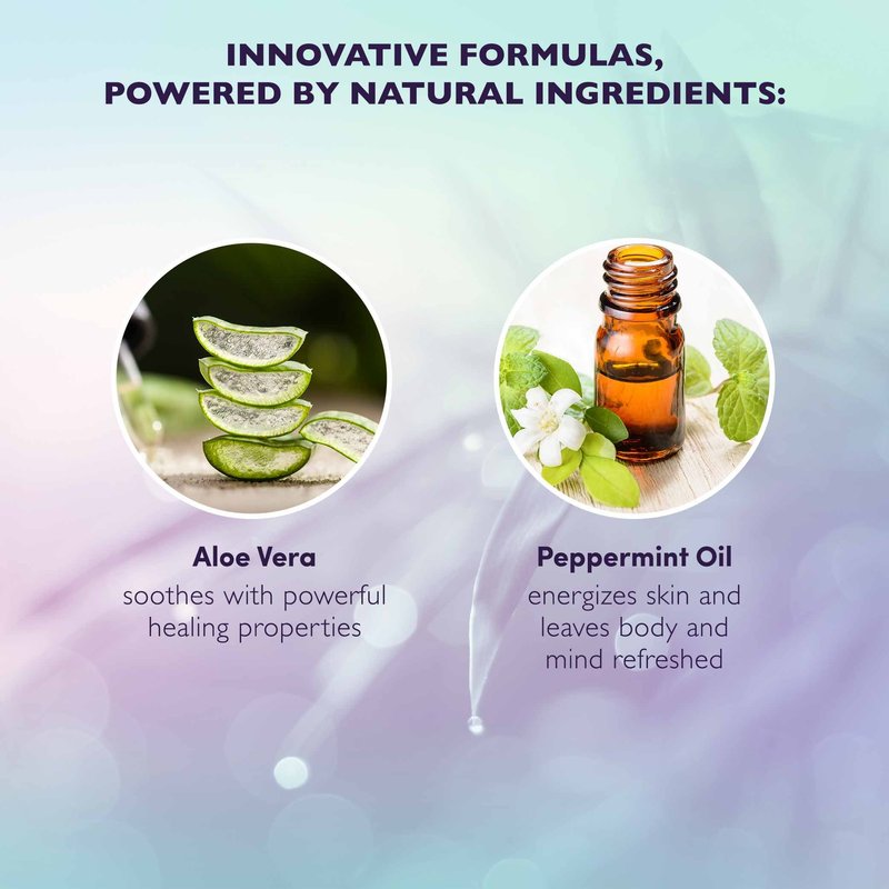 - Aloe Vera and Peppermint Oil soothe and energize skin, leaving body and mind refreshed