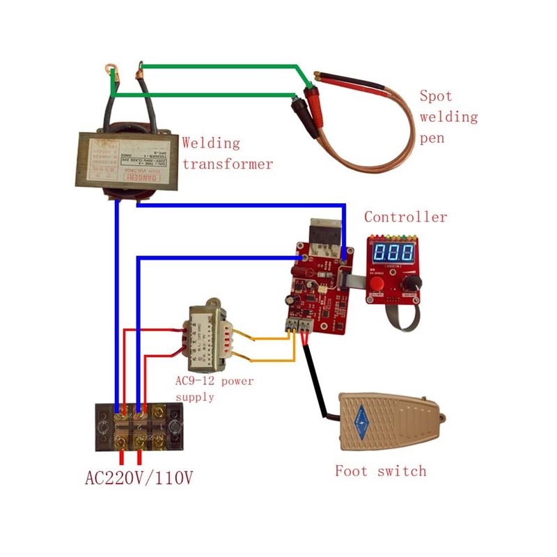 The main features of this controller: 1: Control board operating voltage: AC9-12V, frequency 50/60HZ The welding pulse is a double pulse method, and any welding time is set to 0 to become a single pulse welding 2: With grid voltage compensation, the output can be automatically adjusted according to the change of the mains, to ensure that the effective heat of each welding is consistent with the welding parameters, and the solder joints are uniform 3: Parameter adjustment is the encoder input method, which is more accurate and convenient 4: With welding counting function, the counting range is 0-999, so that you can "know your mind" when welding, and it can be saved after power-off 5: Time input 001-099 cycles, unit cycle (1 cycle is 20ms) current input (000-999 ). The current adjustment step is 0.1%, and the adjustment is more subdivided. 6: Replace the display with a 3-digit blue 0.56 inch digital tube, the size is larger . 7: Onboard power, pedal, trigger, run, time, current, interval, time, current indicator, so that every state has a clear indication 8: The whole board uses STM8 industrial single-chip microcomputer as the main control core 9: Strong and weak electricity are isolated by optocoupler, making operation safer. 10: The power cord and foot switch cord use screw-free quick-connect terminals, which are more convenient and reliable 11: Design a reliable zero-crossing detection circuit to ensure the accurate phase shift of the SCR 12: This controller is compatible with 40A-100A SCR